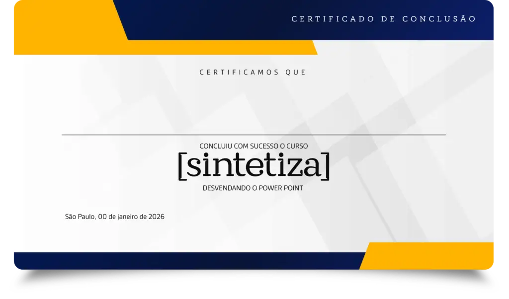 O foco do Sintetiza é o domínio da ferramenta. Você vai aprender a usar o PowerPoint como um designer — entendendo cada função, recurso e atalho que transforma uma apresentação comum em algo profissional.